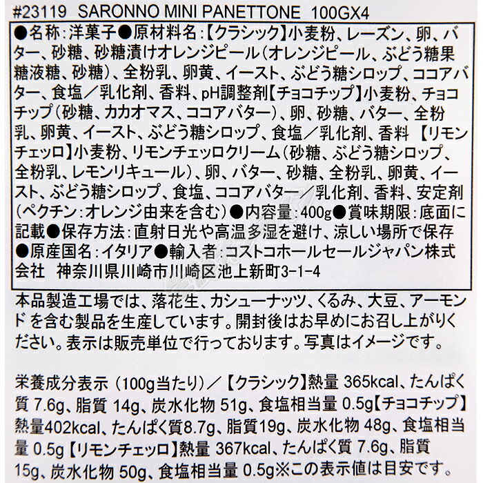 商品説明 商品名 SARONNO MINI PANETTONE 名称 洋菓子 原材料名 【クラシック】小麦粉、レーズン、卵、バター、 砂糖、砂糖漬けオレンジピール (オレンジピール、ぶどう糖果糖液糖、砂糖)、 全粉乳、卵黄、イースト、ぶどう糖シロップ、 ココアバター、食塩/乳化剤、香料、pH調整剤 【チョコチップ】小麦粉、チョコチップ(砂糖、 カカオマス、ココアバター)、卵、砂糖、バター、 全粉乳、卵黄、イースト、ぶどう糖シロップ、 食塩/乳化剤、香料 【リモンチェッロ】小麦粉、リモンチェッロクリーム (砂糖、ぶどう糖シロップ、全粉乳、レモンリキュール)、 卵、バター、砂糖、全粉乳、卵黄、イースト、 ぶどう糖シロップ、食塩、ココアバター/乳化剤、香料、 安定剤(ペクチン:オレンジ由来を含む) 内容量(1ケース) 400g 賞味期限 4カ月〜半年前後(ご購入時期により変動致します) 保存方法 直射日光や高温多湿を避け、 涼しい場所で保存 原産国名 イタリア 輸入者 コストコホールセールジャパン株式会社 商品説明 人気イタリア産パネトーネの、 ミニバージョン『ミニパネトーネ アソート』 ・クラシック×2個 ・リモンチェッロ×1個 ・チョコレート×1個 3種類の味が楽しめるアソートセット♪