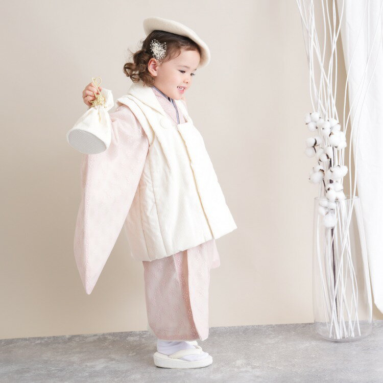 七五三 着物 3歳 被布 セット ひよこ商店 88cm-105cm前後 七五三日本製レース 着物セット 販売 ピンク系 子供 kids ベビーピンク 透け シアー 着物 コーデュロイ被布コート ベレー帽 巾着 草履 足袋 三歳 三才 3才 女児