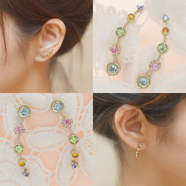 ■本体素材K18シャンパンゴールド(サンプル=本体)アクアマリン(約)2mm 2石ピンクトルマリン(約)2mm 2石グリーンサファイア(約)2mm 2石イエローサファイア(約)1.5mm 2石タンザナイト(約)1.5mm 2石サファイアトータル(約)0.05ct×2■サイズ高(約):19.5mm幅(約):3.9mm厚(約):2.5mm重(約):0.95g×2(キャッチ無し)ポスト(約):0.7×10mm(シリコンダブルロックキャッチ付)※表記はすべて石枠込みとなっております。